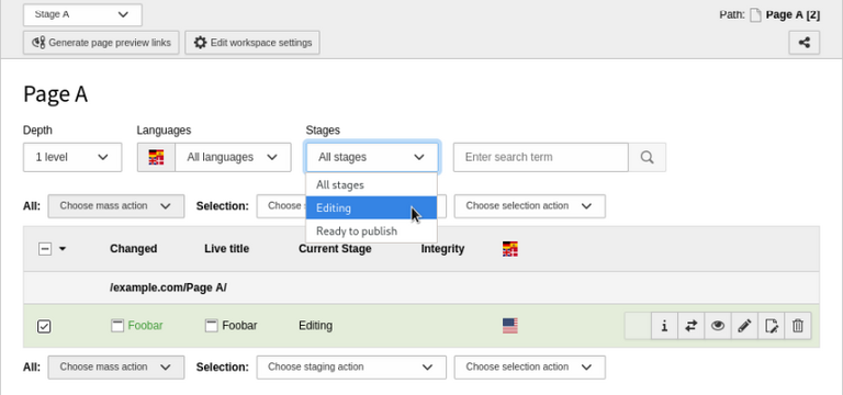 Ein neues Dropdown-Menü im Modul "Arbeitsbereiche" ermöglicht es den Benutzern, Elemente nach einem bestimmten Stadium zu filtern, z. B. "Bearbeitung" oder "Bereit zur Veröffentlichung".