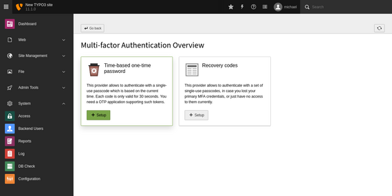 Aber ein einfacher Benutzername und ein Passwort sind einfach nicht sicher genug. TYPO3 v11 bietet eine Multifaktor-Authentifizierung (MFA), die den Anmeldeprozess um einen zweiten Faktor erweitert. MFA macht es für einen Feind insgesamt schwieriger, sich unberechtigten Zugang zu verschaffen.